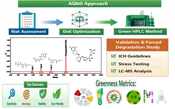يُعد دواء نيروغاسيستات (NGT) أحد مثبطات إنزيم γ-سيكريتاز الحديثة المعتمدة لعلاج الأورام الليفية (Desmoid tumors)، مما يتطلب تطوير طرق تحليلية حساسة ومستدامة لدراسة الشوائب وتقييم النقاوة. تهدف هذه الدراسة إلى تطوير طريقة كروماتوغرافيا سائلة عالية الأداء (HPLC) خضراء ومحددة للاستقرار، وذلك بالاعتماد على نهج التصميم الجيد المبني على الجودة (AQbD). تم تحسين العوامل الحرجة للطريقة، بما في ذلك نسبة الإيثانول، وتركيز محلول أمونيوم الفورمات المنظّم، ومعدل التدفق، باستخدام تقييم المخاطر وتصميم المكونات المركزية (Central Composite Design)، بهدف تحديد مساحة تصميم مثالية تضمن متانة الطريقة. اعتمدت الطريقة النهائية على طور متحرك مكوّن من الإيثانول ومحلول أمونيوم الفورمات بنسبة (24.14:75.86 v/v، بتركيز 0.295 mM ودرجة حموضة 3.2)، وبمعدل تدفق 1.0 مل/دقيقة، حيث حققت فصلًا قاعديًا تامًا بين نيروغاسيستات، شوائبه الناتجة عن التصنيع، ونواتج التحلل، بكفاءة عالية (حوالي 15,900 صفيحة نظرية) وشكل قمم ممتاز (معامل التذييل ≤ 1.1). أكد التحقق من صحة الطريقة وفق إرشادات ICH Q2(R2) على خصوصيتها، وخطيتها (R² > 0.999)، ودقتها (نسبة استرجاع 99.4–101.2%)، وإحكامها (%RSD ≤ 1.8%)، ومتانتها. كما أظهرت الطريقة حساسية عالية من خلال قيم حد الكشف (LOD) وحد التقدير الكمي (LOQ)، والتي بلغت 11.58/35.10 جزء في المليون لنيروغاسيستات، و≤ 0.52/1.58 جزء في المليون للشوائب. وأوضحت دراسات التحلل القسري حدوث تحلل يتراوح بين 3–14% تحت ظروف إجهاد مختلفة مع تحقيق توازن كتلي بين 95–105%، مما يؤكد قدرة الطريقة على تتبع الاستقرار. كما تم تقييم “خضرة” الطريقة باستخدام عدة أدوات تقييم مثل AGREE وAGSA وCACI وCaFRI، حيث بلغ مؤشر البياض الكلي 74%، مما يعكس طابعها المستدام. وبشكل عام، تقدم هذه الطريقة المعتمدة على الإيثانول والمُحسّنة باستخدام AQbD منصة تحليلية موثوقة ومستدامة ومتوافقة مع المتطلبات التنظيمية، لتحليل الشوائب ودراسة ثبات نيروغاسيستات بكفاءة عالية